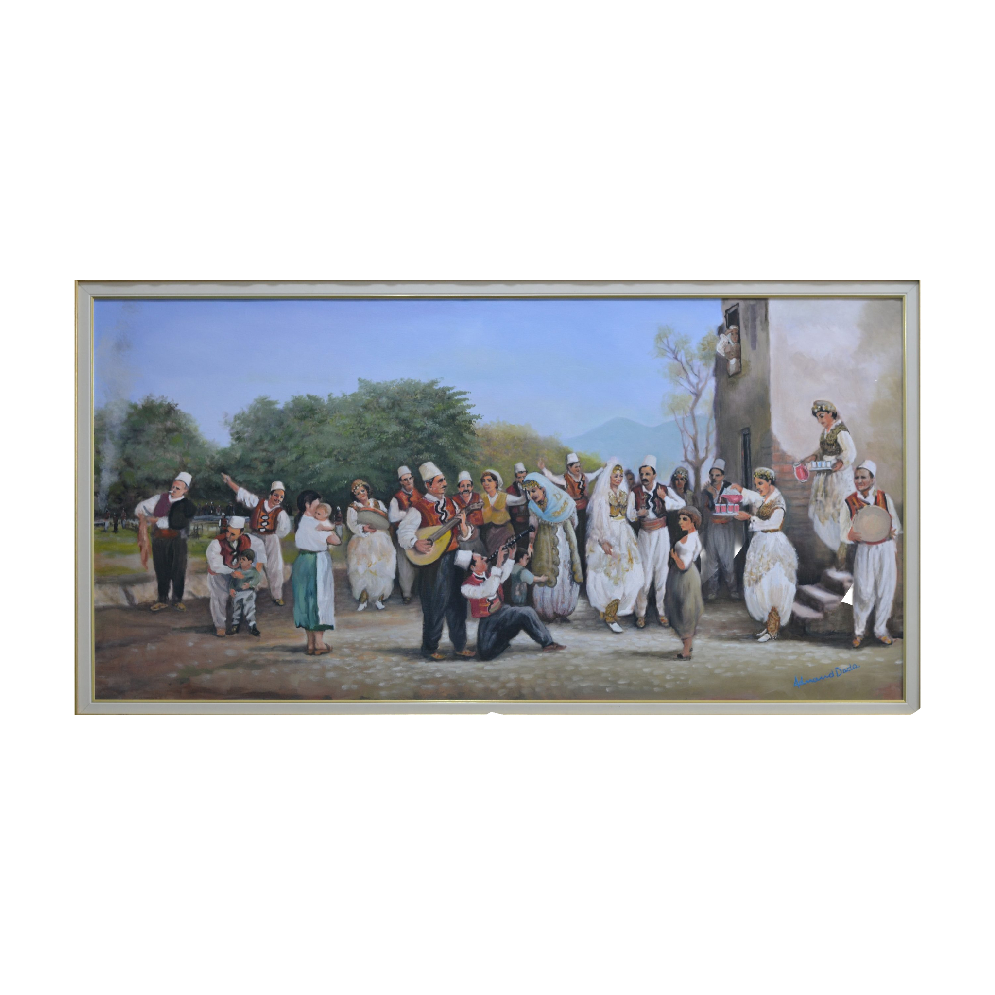 Painting titled “Tirana wedding”. Moments from the wedding of a family from Tirana with traditional clothing of the wedding party and the couple.