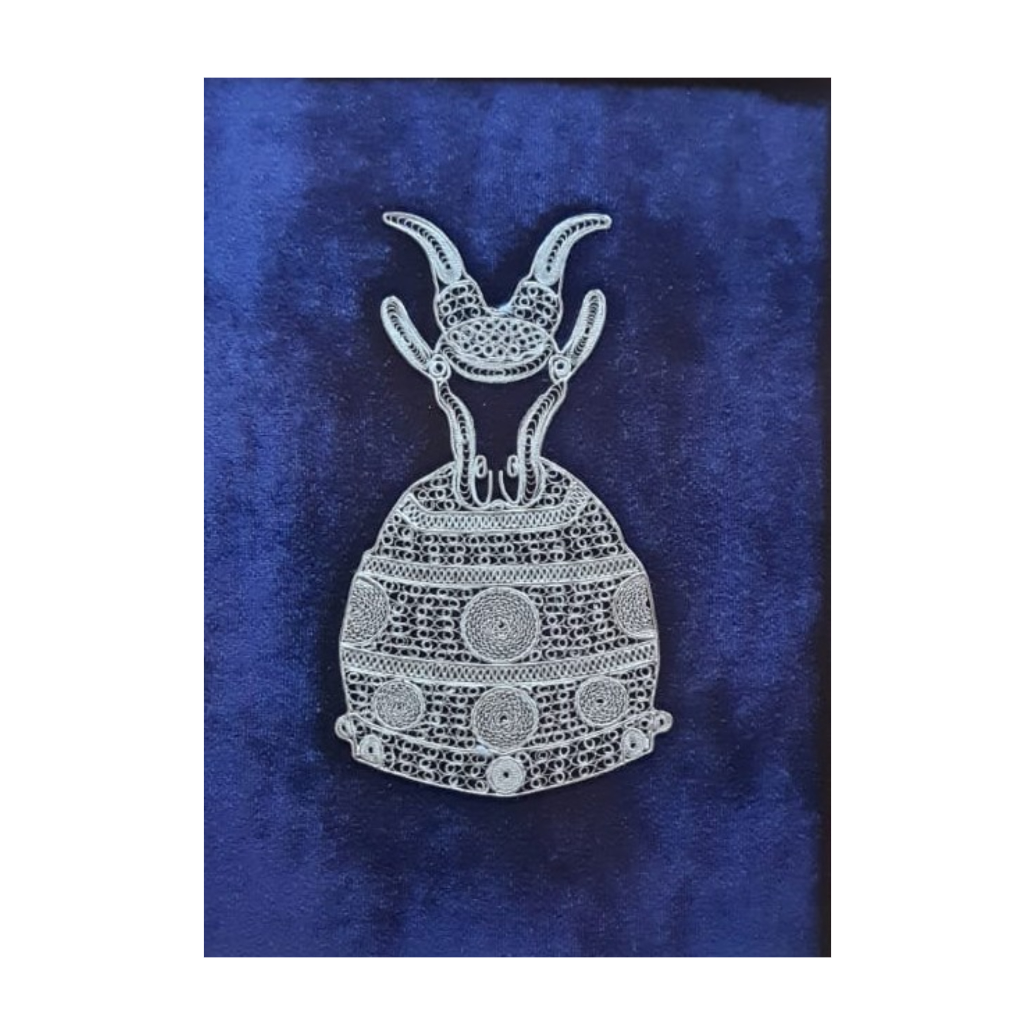 A filigree figurine depicting the silhouette of Skanderbeg’s legendary helmet. The work is crafted with special craftsmanship using pure silver thread down to the finest details.