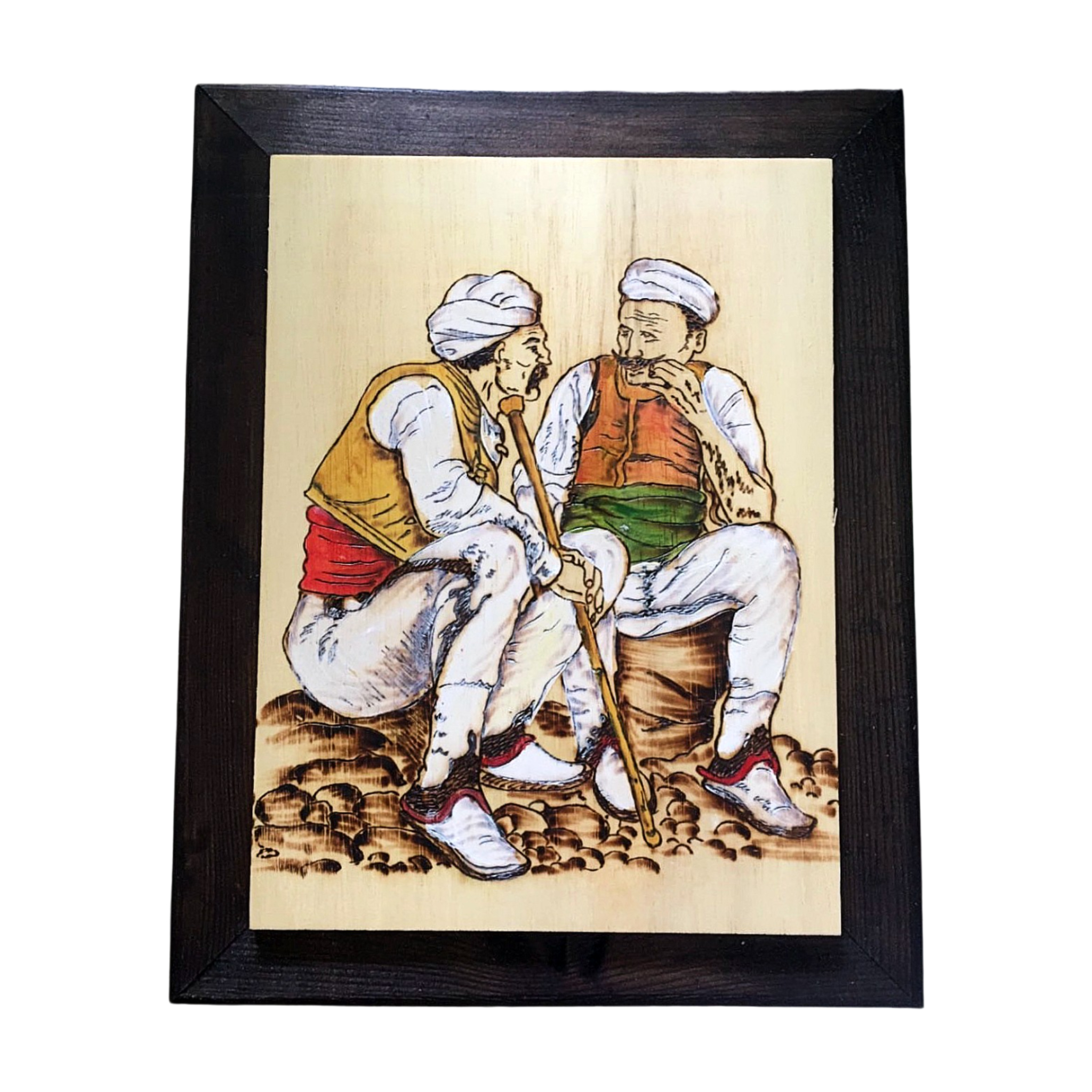 Wood painting made with pyrography. Motifs of the clothing of men from the Northern Highlands.