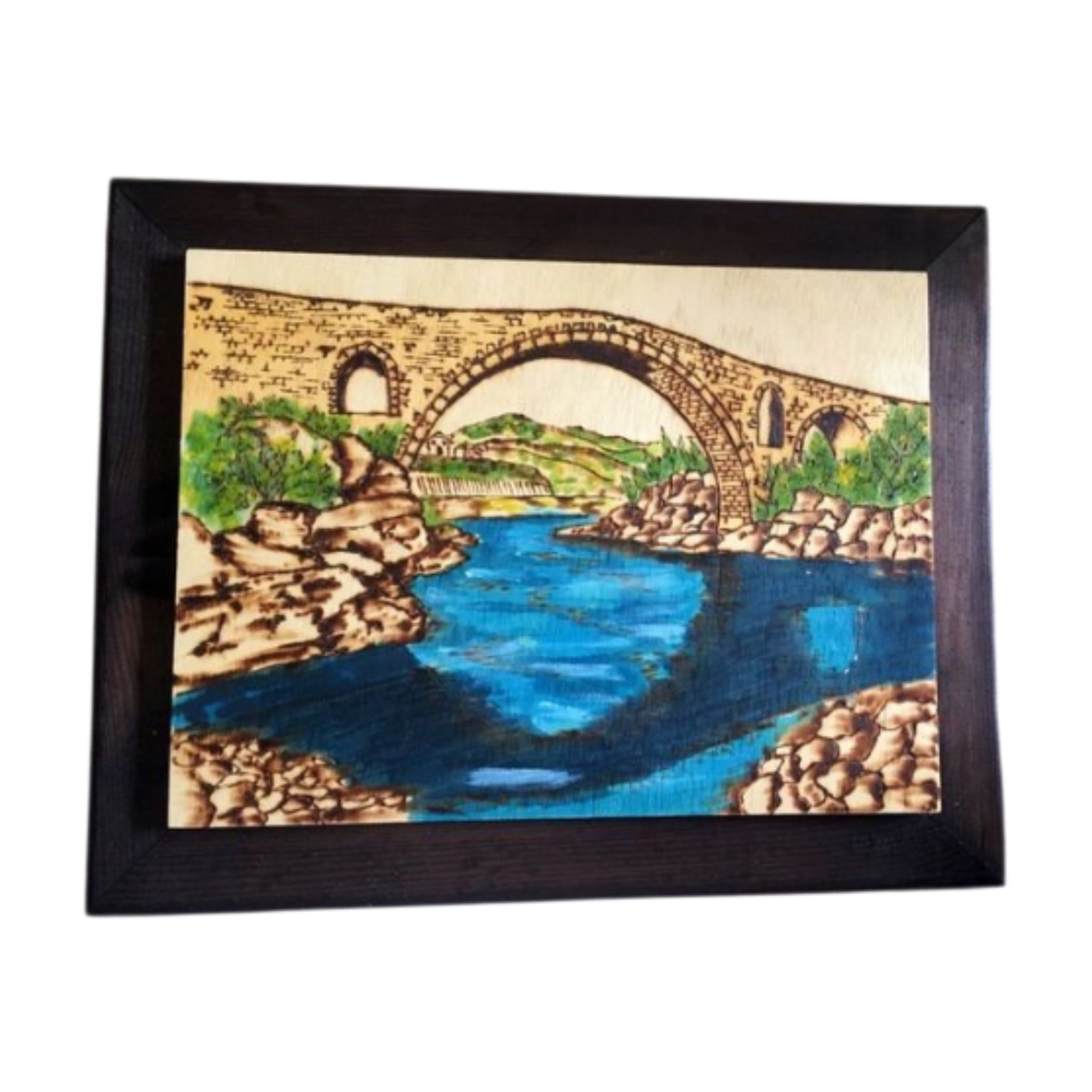Pyrographic wood painting with the decor ”Mesi Bridge” in Shkodra.