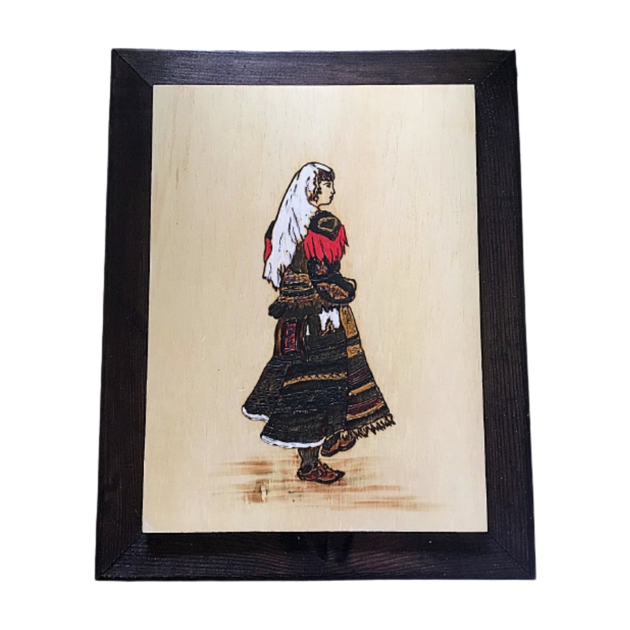 Wood painting made with pyrography. A highlander girl dressed in a jubleta.