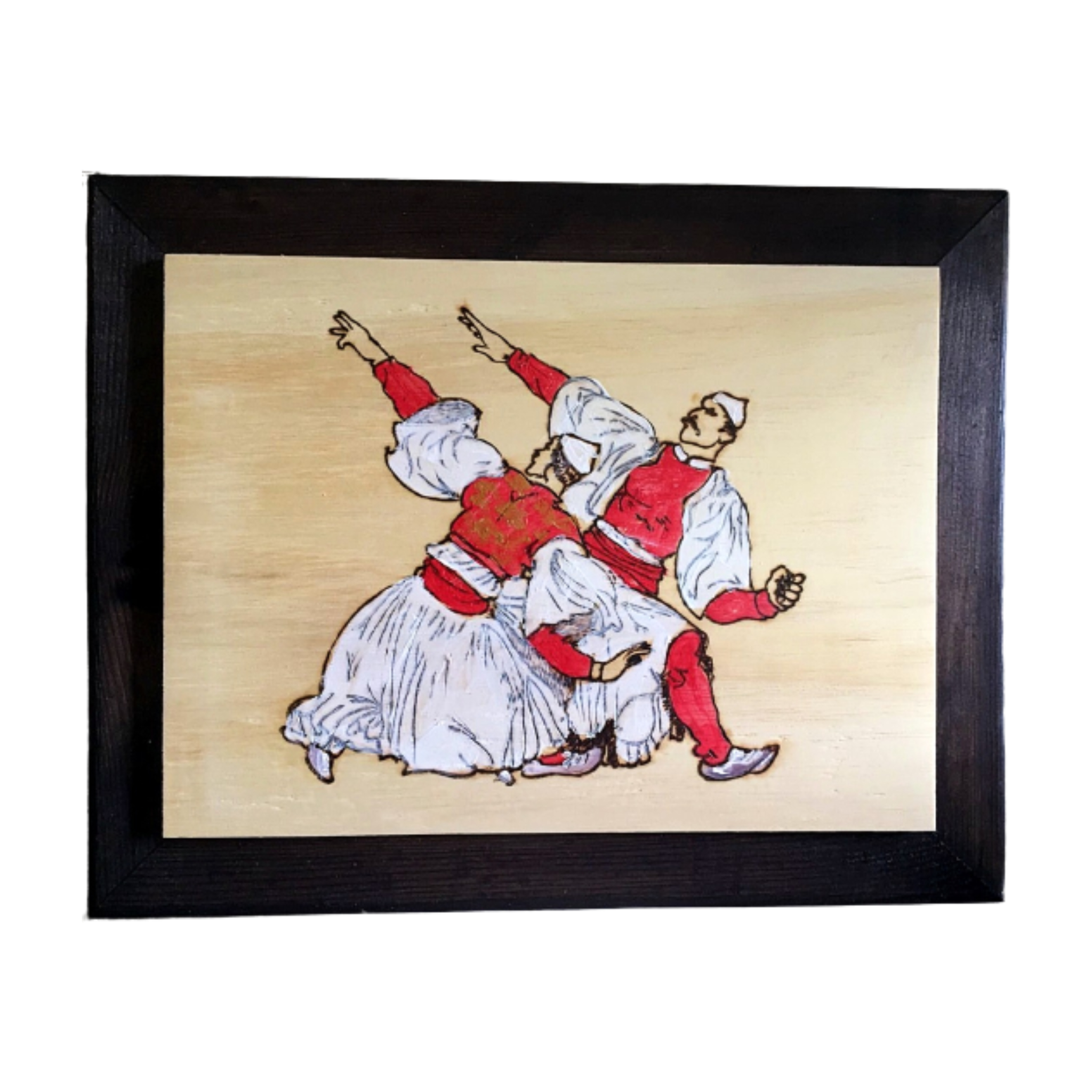 Wooden painting decorated with dancers dressed in the folk costumes of Southern Albania.