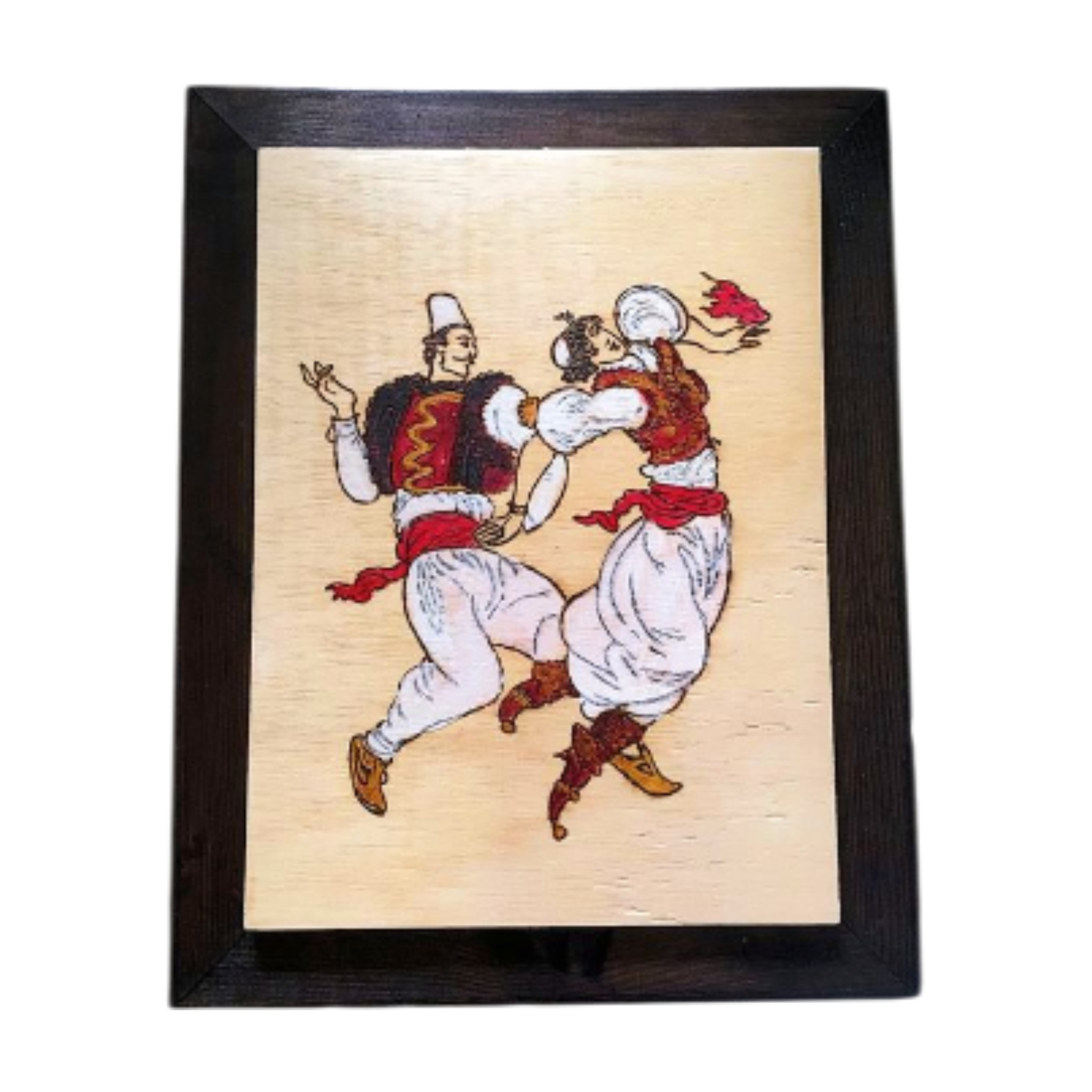 Wooden painting decorated with dancers dressed in the folk costumes of Central Albania.