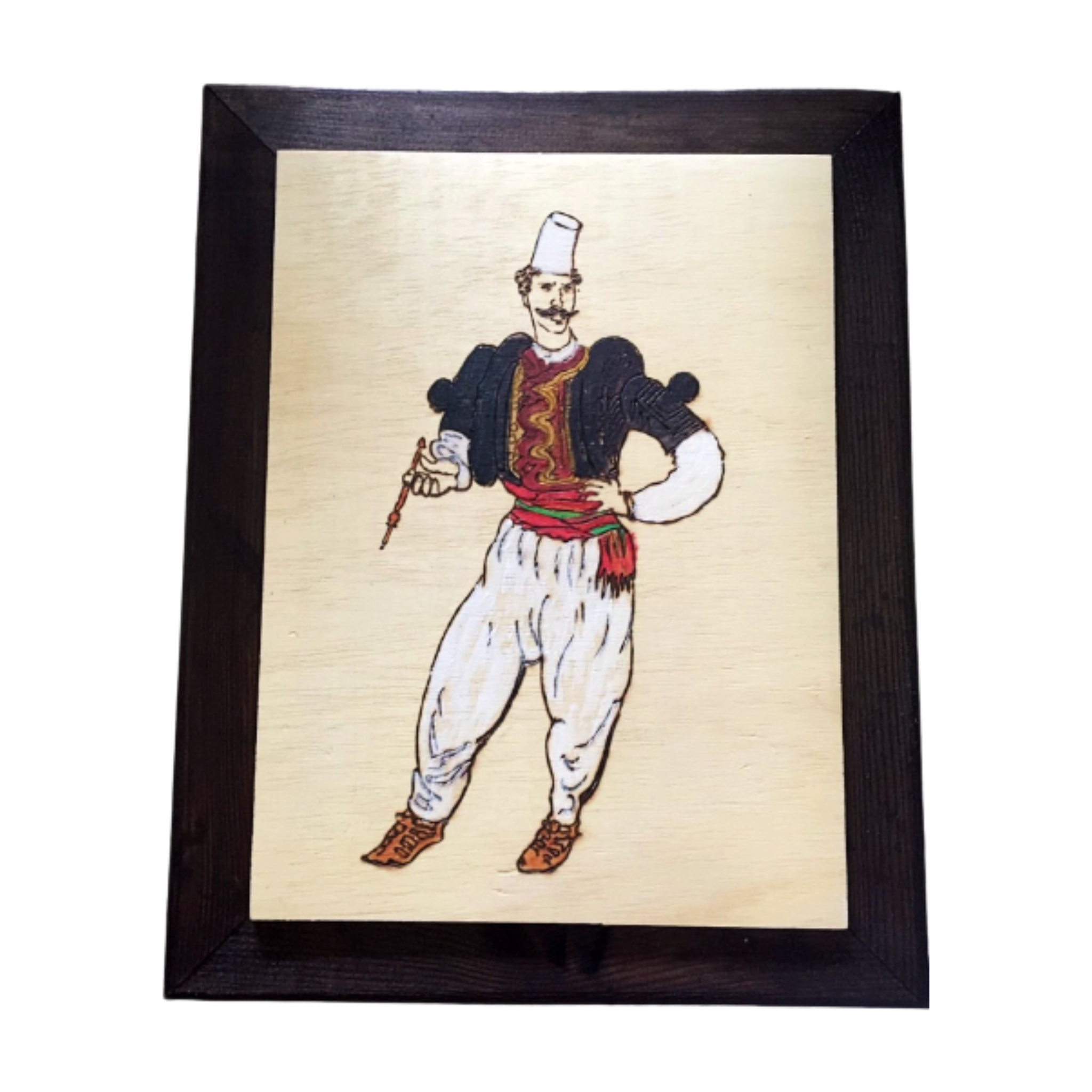 Wood painting made with pyrography. Motifs of men’s folk clothing in Tirana and the surrounding area.