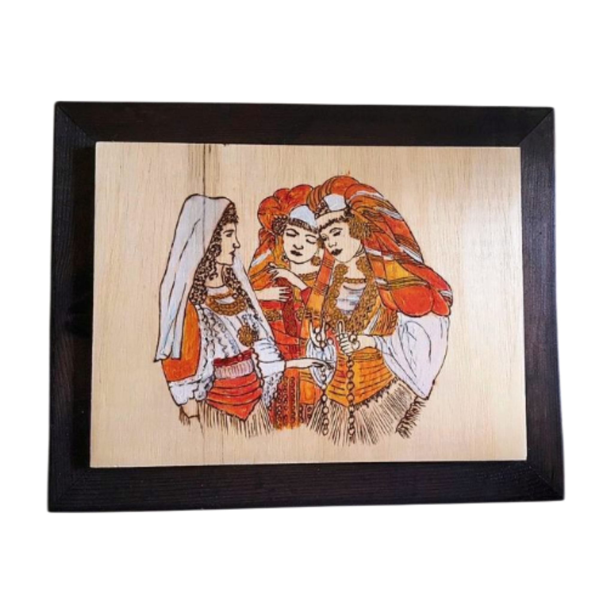 Wooden painting decorated with motifs of the traditional dress of girls from Northern Albania.