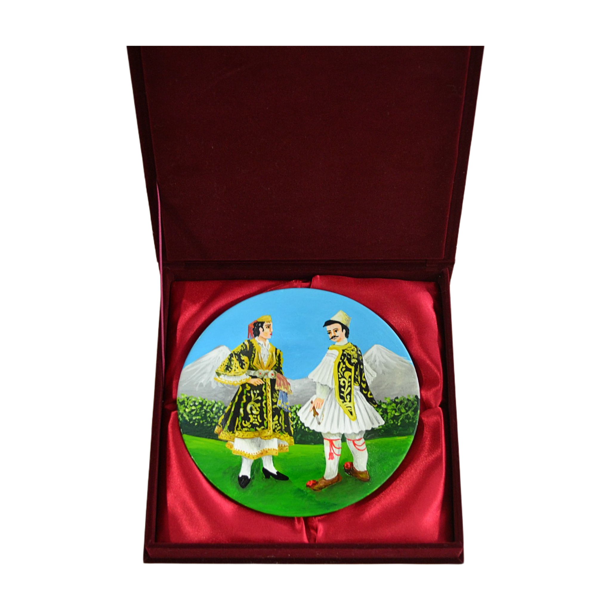 Decorative ceramic plate placed in promo box. Motifs of traditional clothing of the Gjirokastra area can be seen in the decor.