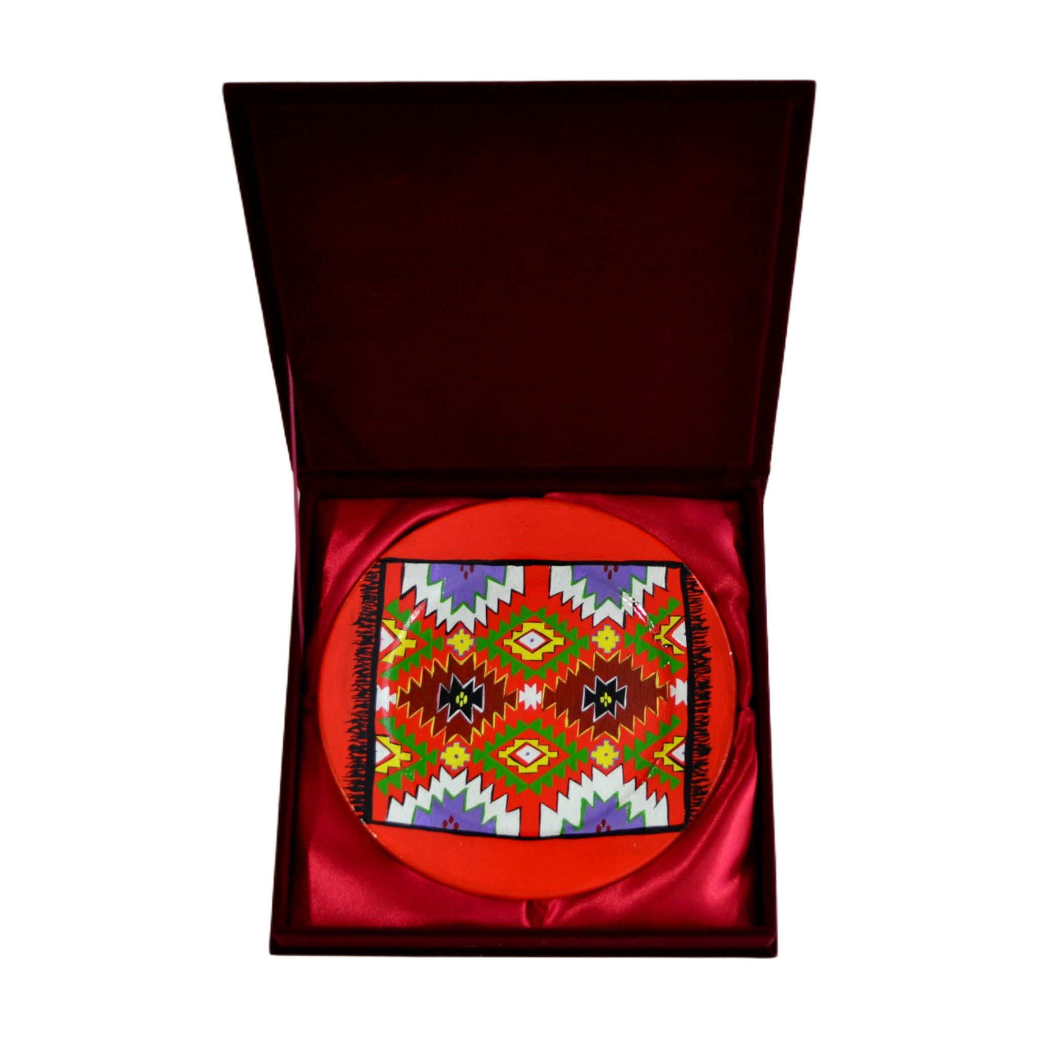 Decorative ceramic plate placed in promo box. The motifs of the traditional Albanian carpet stand out in the decor.