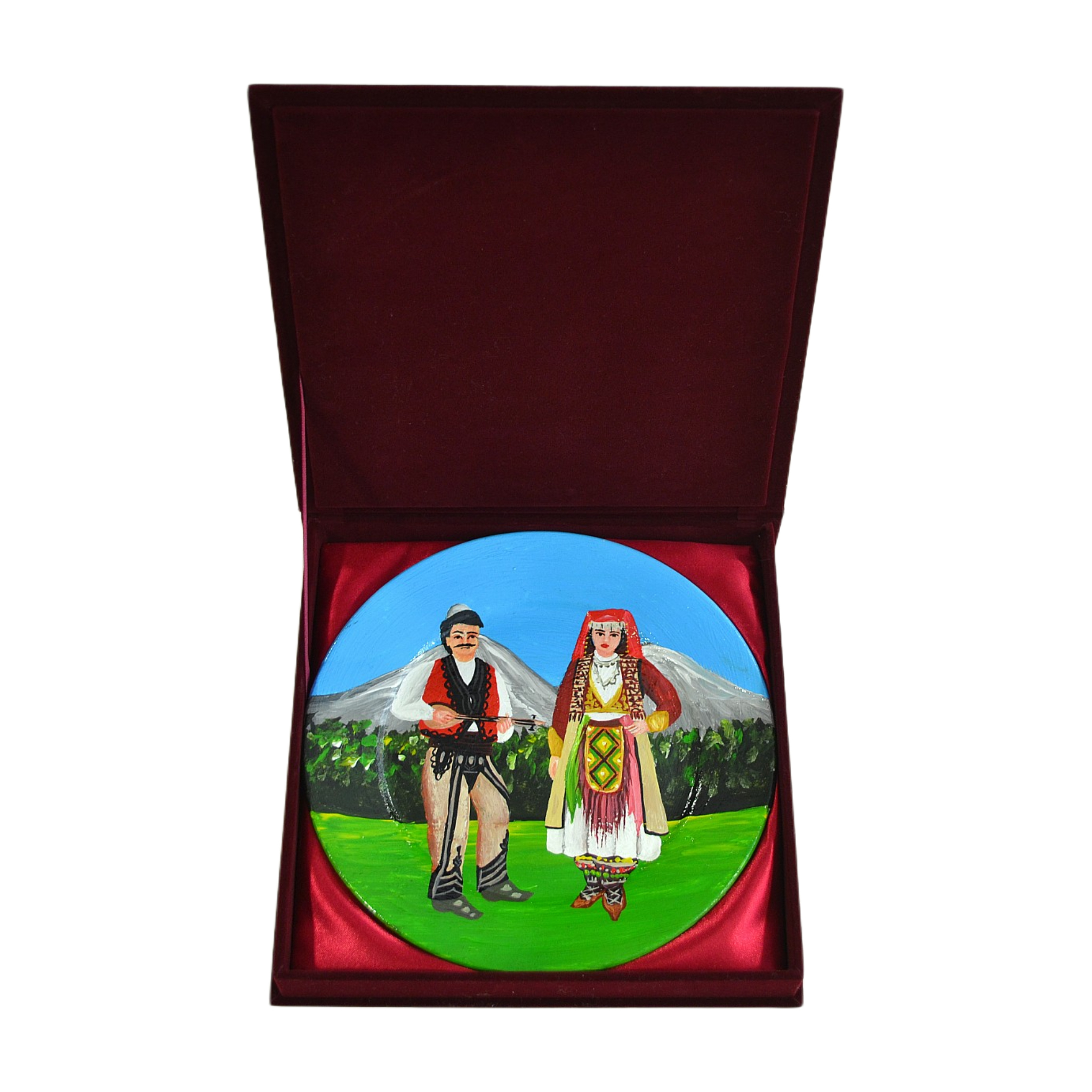 Ceramic decorative plate in promo box. The decor shows the motifs of the men’s and women’s clothing from Mirdita.