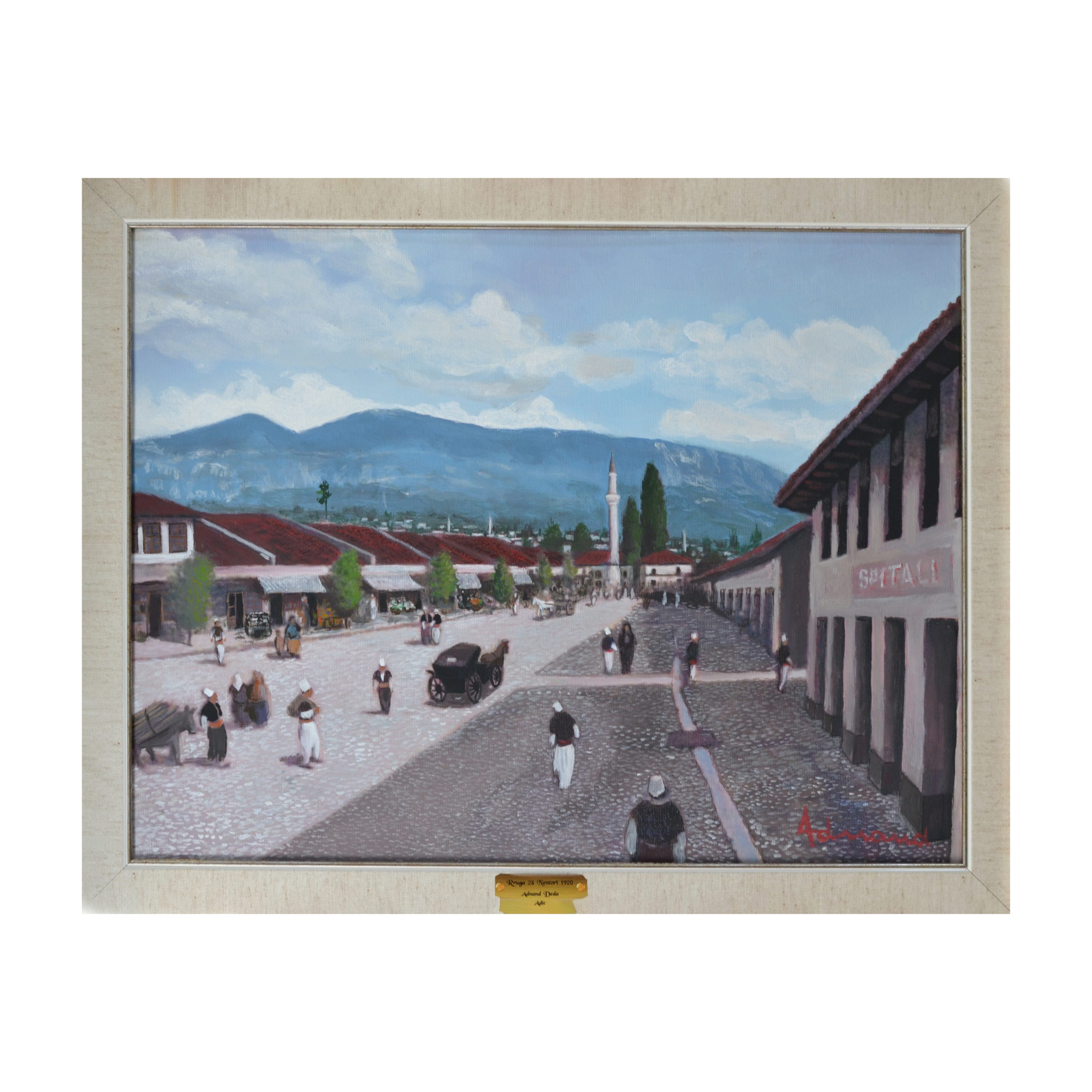 Painting titled “Street 28 November 1920”. This painting conserves the architectural and cultural heritage of 1920 of one of the streets of Tirana.