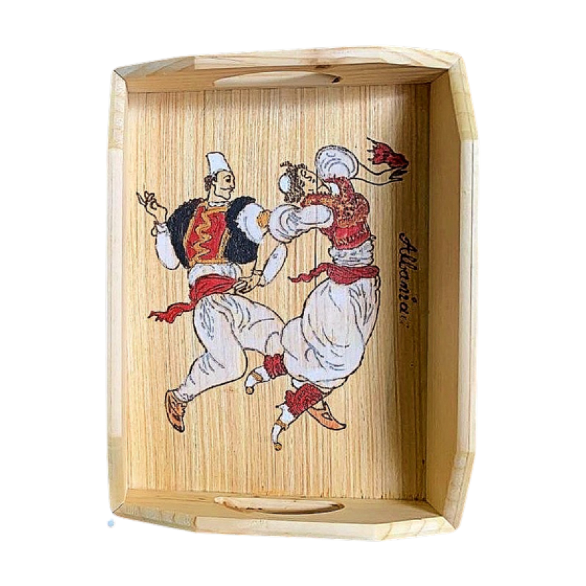 Wooden tray decorated with dancers dressed in the folk costumes of Central Albania.