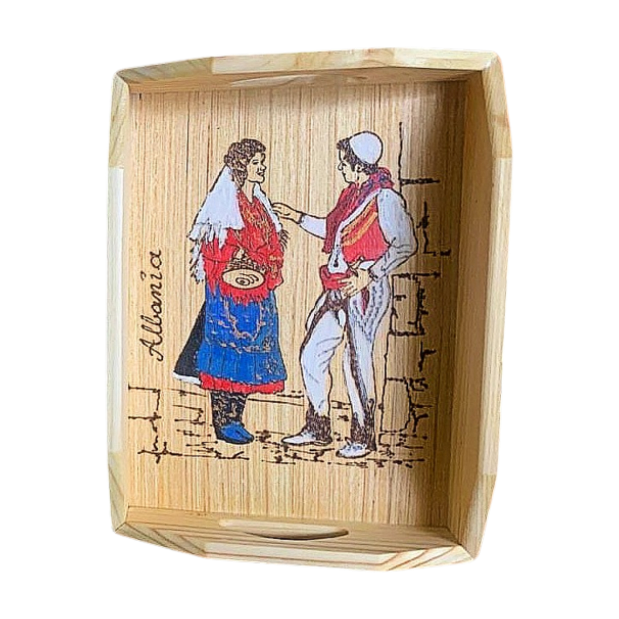 Wooden tray decorated with motifs of men’s and women’s clothing from the northern regions.