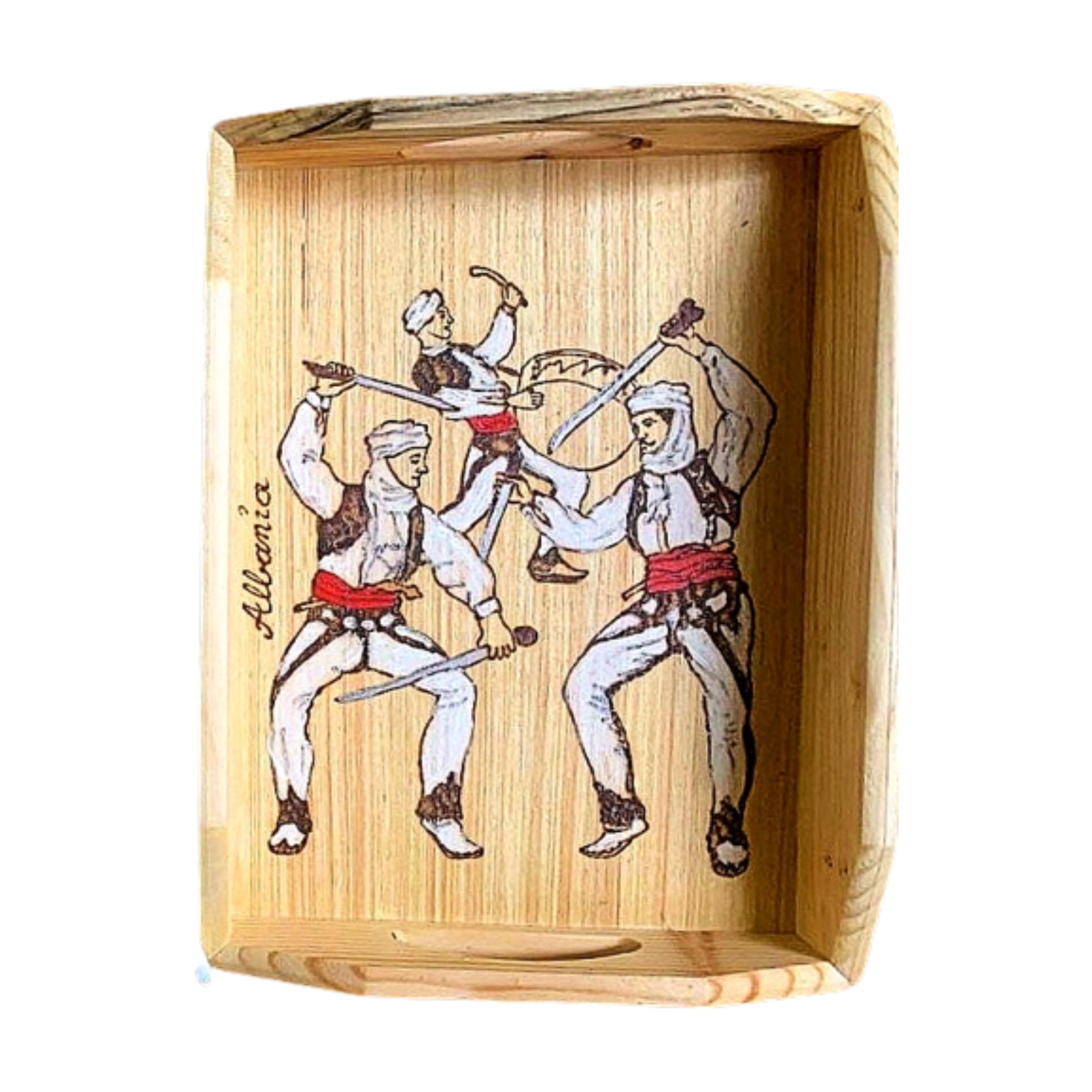 Wooden tray decorated with dancers dressed in the folk costumes of Northern Albania)