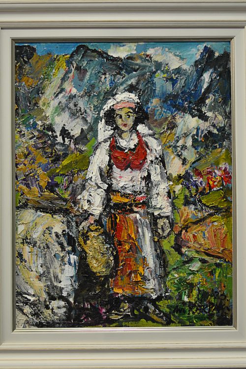 Description: Painting entitled "Girl of Tropoja", where the dress of the Tropoja tradition stands out, by the painter Muhamet Kërpaçi