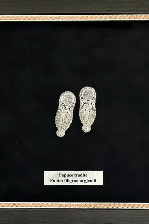 Përshkrimi: Figurinë e punuar në filigran si nderim i kujtimit të Sabiha Kasimati, biologe dhe punonjëse shkencore, e cila konsiderohet të jetë gruaja e parë shkencëtare shqiptare.