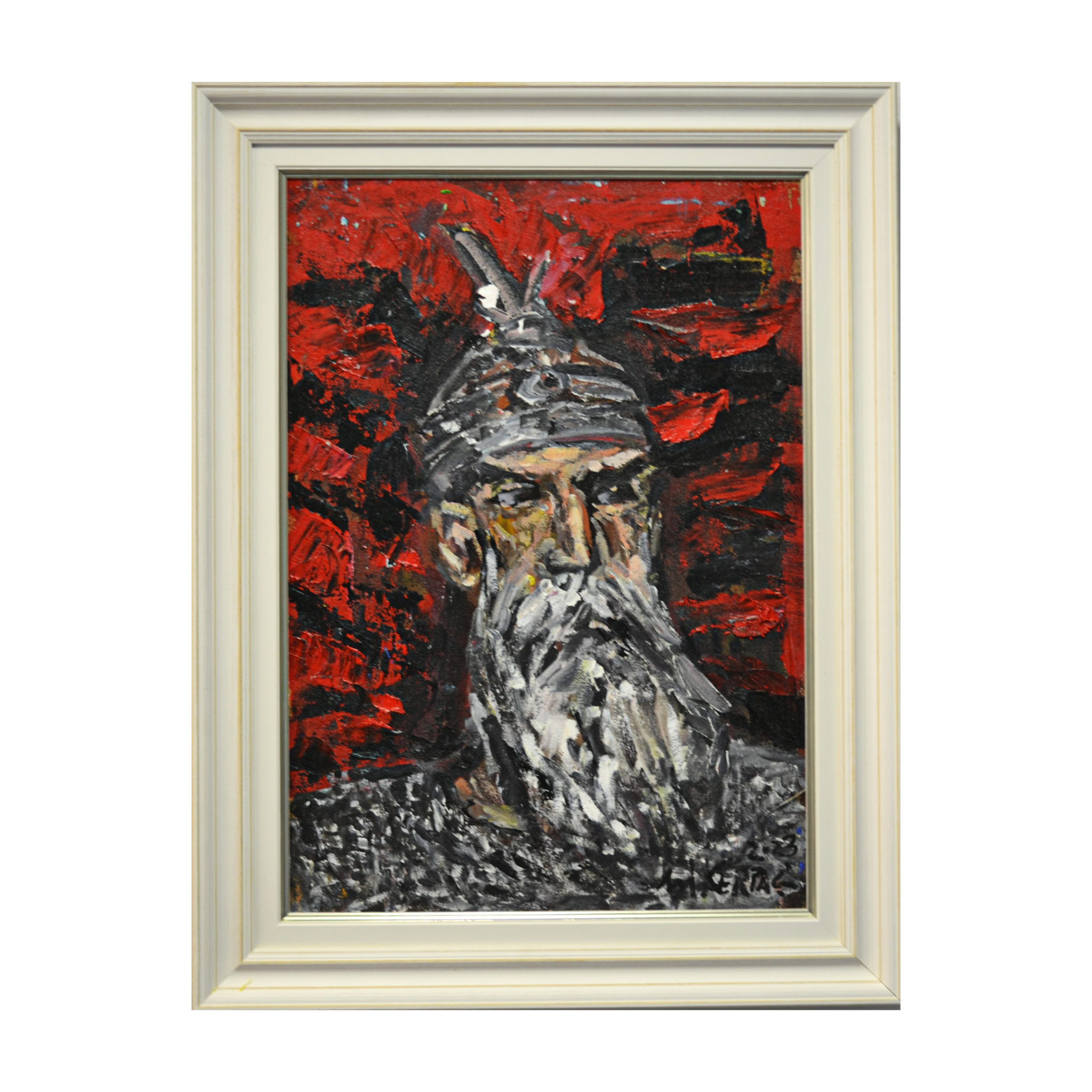 Piktura me titull “Skënderbeu" në sfond me flamurin e Shqipërisë, nga piktori Muhamet Kërpaçi.
